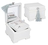 Reed & Barton , From our Small Wonders Collection of value-priced chests, the Emma is designed to be space-efficient while offering ample space for storing small treasures. Adorned with a lush silver tassel, this chest features a contemporary white finish with pearl white flocked interior, mirrored lid, pull-out tray. 6" x 5 7/8" x 4 3/8" high. ...