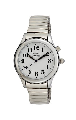 TimeOptics Women's Talking, Finally, a talking watch that is easy to use, all the functions you desire and looks great. Introducing the premium series talking watch collection from TimeOptics that features both a male and female voice option on one watch with a simple press of a button. Other features include the crisp, clear announcement of the time, day, date and year, alarm function plus an advanced movement that synchronizes both the analog and talking time while setting...and setting is easy. Besides sounding great, this timepiece is built to last and looks beautiful. The case is highly polished, the crystal is scratch resistant mineral glass and the comfortable expansion flex bracelet is made of hypo-allergenic stainless steel. The bright white dial with dark contrasting bold black numbers plus the bold fancy hands make the time easy to look at and read. In addition, the stylish pumpkin shaped crown with cabochon makes this a fashion timepiece as well as a functional one. As always, your watch will arrive in a beautiful gift pouch then boxed, include detailed operating instructions and a hassle free lifetime limited warranty.